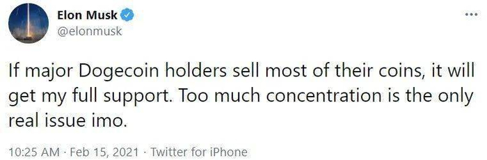 2月15日,马斯克发推表示,狗狗币的问题在于持币太过集中,支持狗狗币大玩家进行抛售,狗狗币应声大跌,跌幅一度扩大至23%。