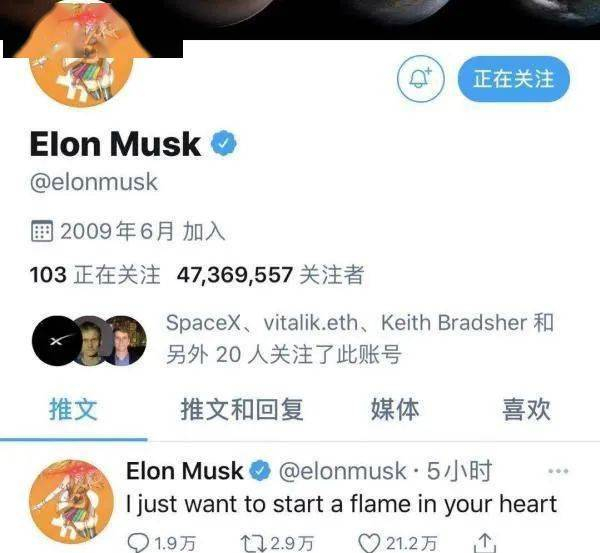 2月20日早晨,马斯克将推特头像更换为怀抱比特币符号的动漫人物,并且连发两条推文称,“只一天”、“我只想点燃你心中的火焰”,以示自己对比特币的看好。