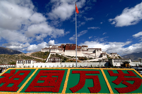 2007年9月30日,国庆节前夕,布达拉宫前的广场上摆放着“祖国万岁”巨型花坛。图|新华社