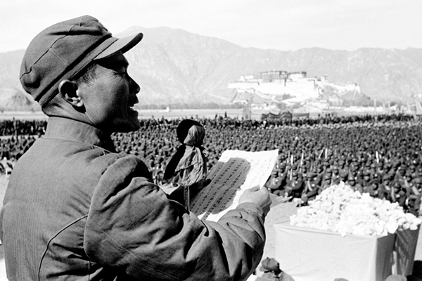 1951年12月20日,中国人民解放军入藏部队在西藏拉萨布达拉宫广场,举行庆祝中国人民解放军拉萨胜利会师大会,18军军长张国华在大会上讲话(资料照片)。图|新华社