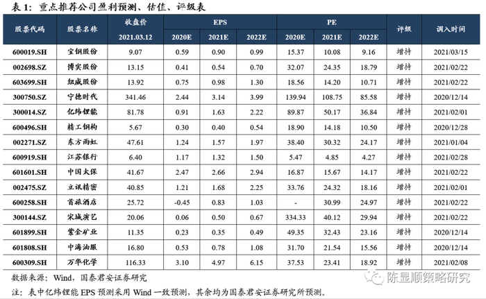 继续看好周期,变化在于全球原材料周期的末端与碳中和概念的开端。后疫情时代周期行情经历三个阶段,2020Q2-Q3的第一阶段是受益于逆周期对冲的基建地产周期,2020Q4起的第二阶段预期层面自国内复苏转向全球复苏,石化/基化等全球原材料周期龙头远端受益于海内外经济增长共振、欧美补库存,近端则直接受益于涨价,具备较高的赔率和胜率。当前的第三阶段,我们认为要重视碳中和概念带来供需格局的进一步颠覆,分别对应周期端的供给侧改革与消费端的需求侧变革。一方面碳中和对传统周期行业的影响类似于一轮供给侧改革,为了实现2030年碳达峰的目标,需要严格限制高耗能行业新增产能,在此背景下,钢铁、煤炭、电解铝及智能电网都有投资机会;另一方面低碳生活推动消费端的需求变革,装配式钢结构、消费电子、家居智能化和生态绿化等也值得关注。推荐碳达峰、碳中和部署主题:钢铁(宝钢股份)/新能源(宁德时代、亿纬锂能)。此外推荐三条主线:1)通胀魅影浮现,居民与企业部门同步复苏下需求与盈利扩散+外延信贷依赖削弱、内生现金流创造能力增强+中游成本可转嫁的共振方向:机械(纽威股份/博实股份);2)高景气延续的全球原材料周期:有色(紫金矿业)/石化(中海油服);3)预期充分调整、回归基本面增长的科技:电子(立讯精密)。同时继续看好具备稀缺性的互联网港股龙头。