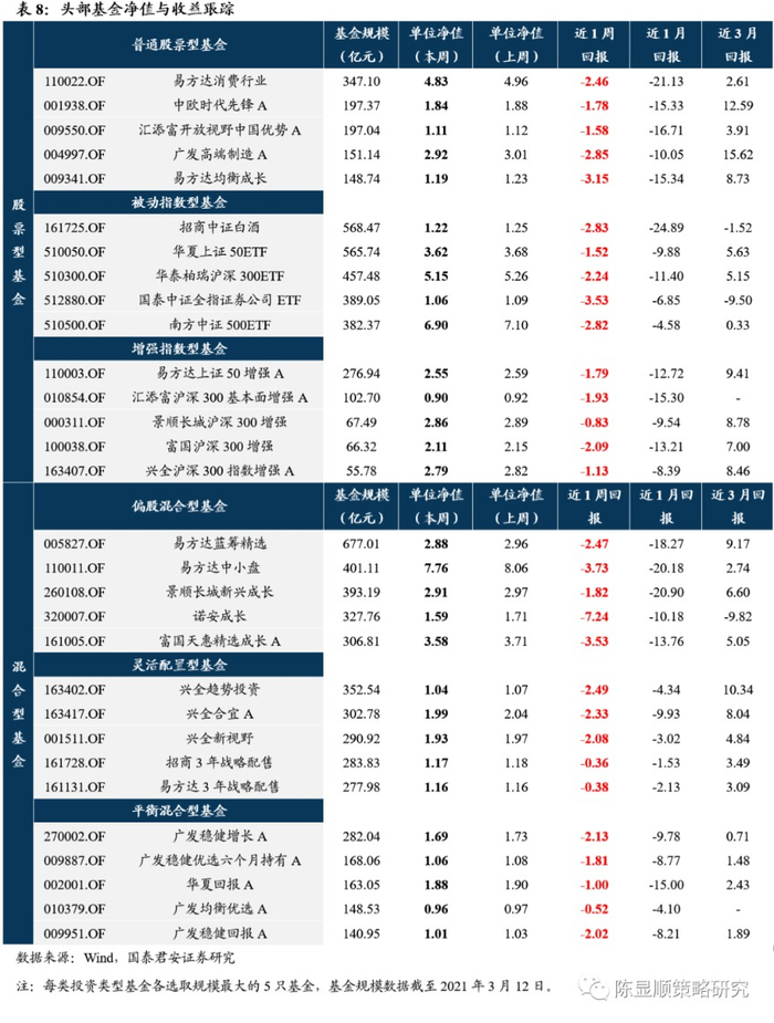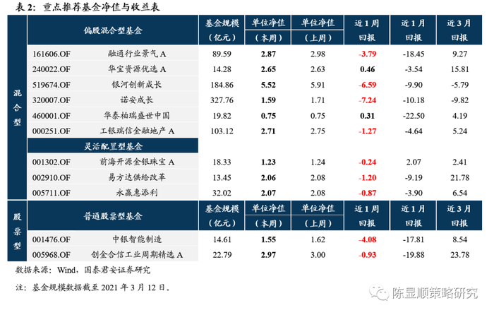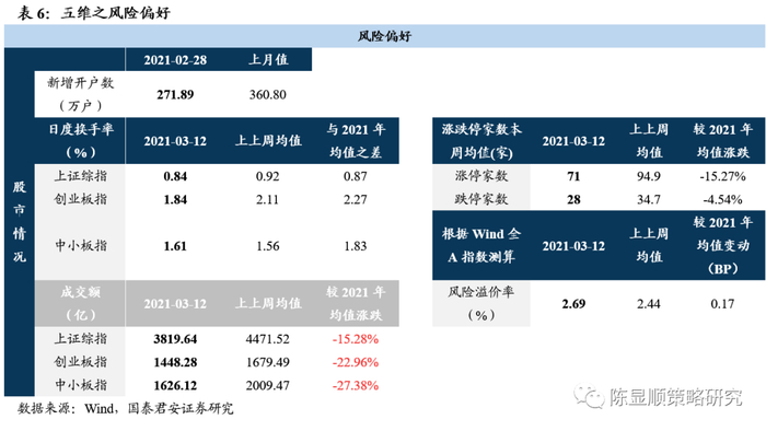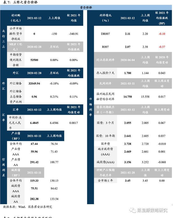 市场的下跌是在基本面充分透支的背景下,利率上行的预期及微观筹码结构恶化导致的结果。分子端基本面预期的打满、分母端金融市场资金利率预期的上行和交易层面抱团股微观结构的恶化令周内的盘跌尽数回吐开年以来的收益,我们于1月14日提出的“A股史上首次蓝筹股泡沫”破裂。投资者心中的基本面预期(包括近端盈利预期和远端成长预期)并未明显下调,只是边际上抬升乏力,同时2月社融、信贷增速超预期回升更多的是基数效应与“就地过年”下提前复工的结果,中期信用收缩“公司盈利承压的隐忧仍存,这固然不是本轮下跌的主因却是一个重要前提。金融市场资金利率上,沪深300所隐含的预期收益率与十年期国债收益率2.8%的差值已降至过去十年的最低位,预示高估值股票对利率抬升的高敏感。结构上期限利差较短期利率更为关键,增长预期+通胀预期(全球大宗品上涨引发的输入型通胀)抬升下过去机构抱团股强调的远端现金流的贴现价值降低,利率与高估值的矛盾突显。而市场的调整又引发微观交易结构崩塌这一更深层次的问题,此前微观流动性层面的”正反馈“正逐步逆转为”负反馈,基金潜在赎回的冲击不容忽视。往后看,整个市场上行的动能在于结构上的盈利的修复,下行的压力来自利率上行的预期和微观交易结构的问题。对于后市,我们维持震荡的趋势,以高估值龙头股为代表的股票未来需要横盘震荡消化筹码集中及估值的压力。