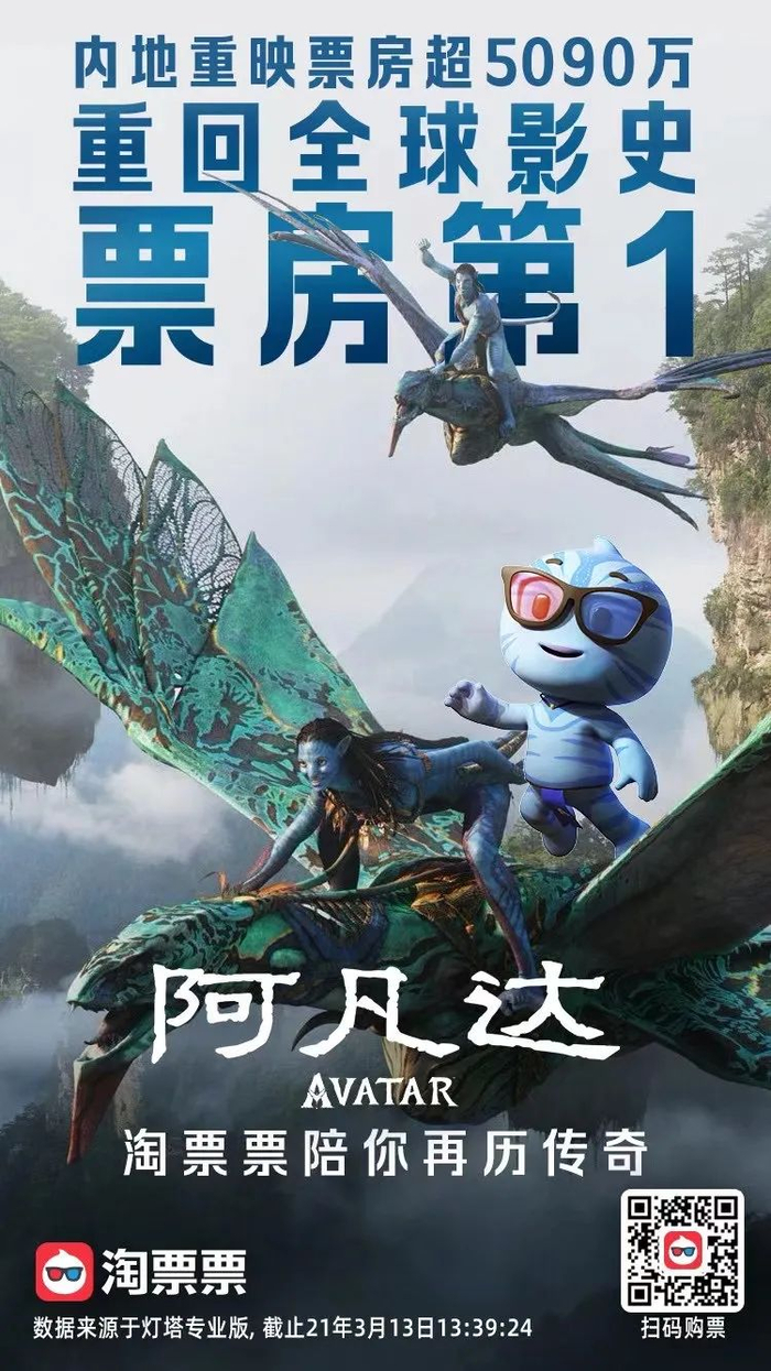 截至3月13日13时许,电影《阿凡达》内地重映票房突破5090万,反超《复仇者联盟4: 终局之战》,重回全球影史票房冠军宝座