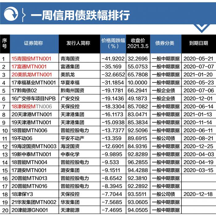 本周交易日(20210308-20210312)信用债(包括企业债、公司债、中期票据、短期融资券)价格跌幅(排除派息等因素导致的价格下跌)前20只债券,跌幅范围为-41.92%至-7.47%。