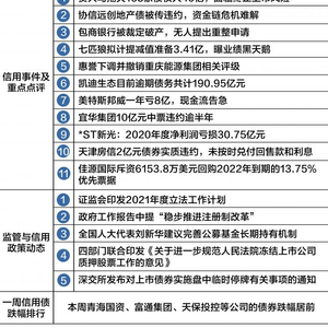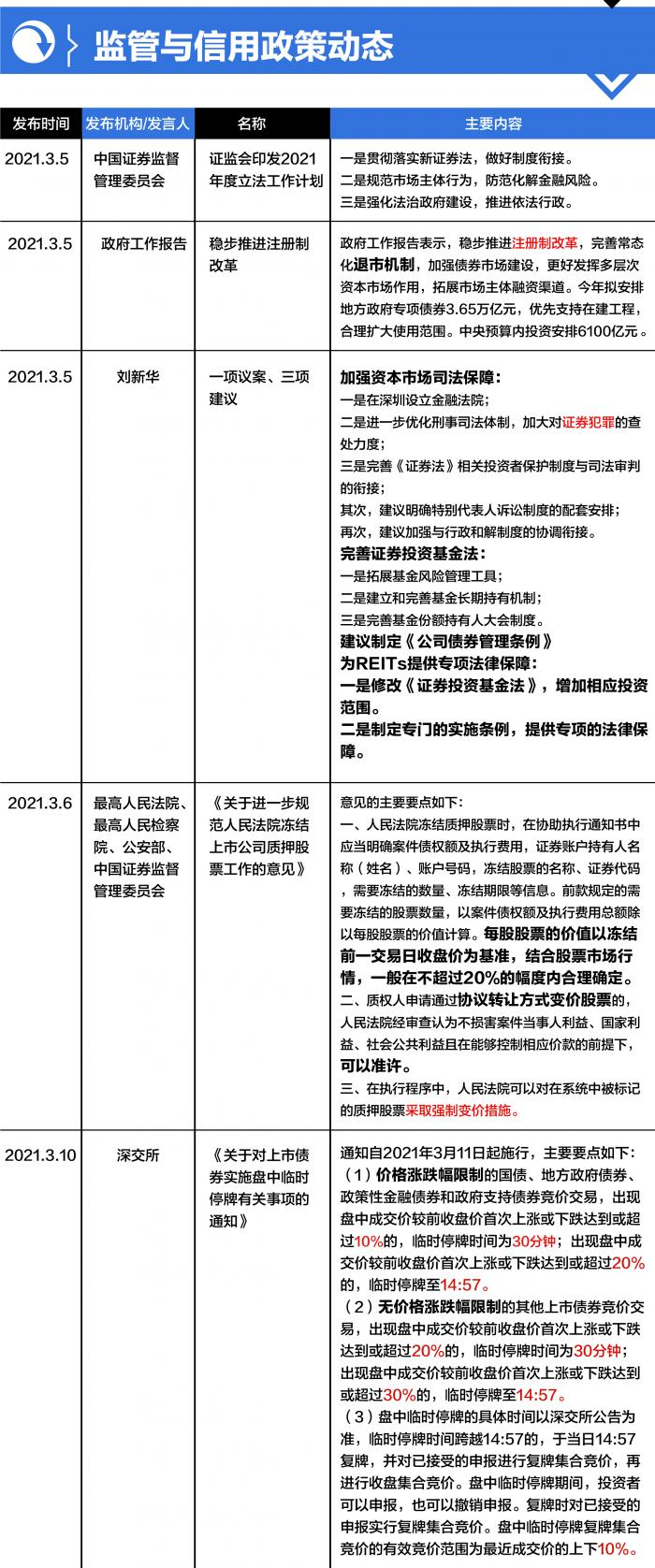 本周共有5项监管与信用政策动态:(1)证监会印发2021年度立法工作计划;(2)政府工作报告中提“稳步推进注册制改革”;(3)全国人大代表刘新华建议完善公募基金长期持有机制;(4)四部门联合印发《关于进一步规范人民法院冻结上市公司质押股票工作的意见》;(5)深交所发布对上市债券实施盘中临时停牌有关事项的通知。
