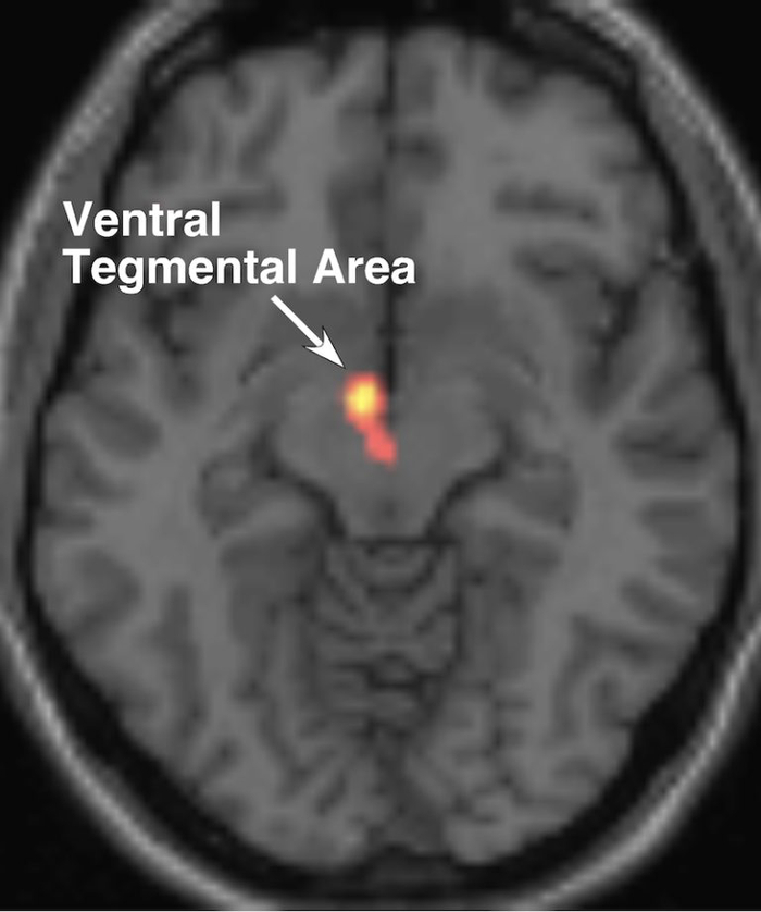 Nicola Jones:爱情会伴随着很多不同的情感。但脑部扫描仪显示,每个热恋中的人大脑底部的腹侧被盖区(ventral tegmental area,VTA)都有着相似的活动。这块脑区会分泌出多巴胺——这是脑中的一种化学信号,它会给予你能量、专注力、动力和极度的渴望。