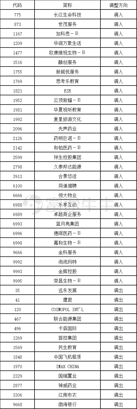 远东发展、鹰君、民生教育、IMAX CHINA、江南布衣、神威药业、渤海银行等被调出。