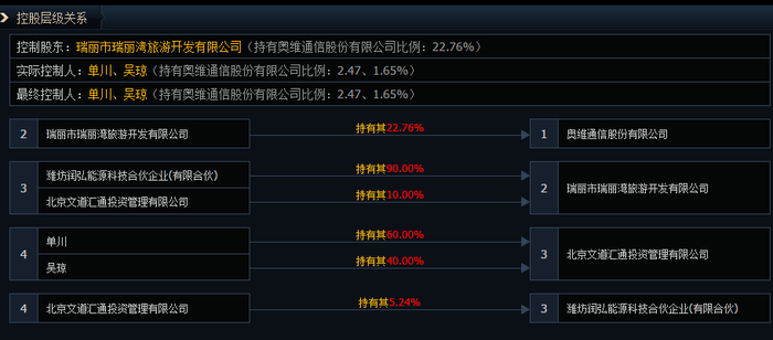 2019年3月11日,奥维通信发布公告称,接到公司大股东瑞丽市瑞丽湾旅游开发有限公司通知,瑞丽湾股东云南景成集团有限公司与潍坊润弘科技合伙企业(有限合伙)3月8日签署协议,景成集团将其持有的瑞丽湾51%的股权转让给潍坊润弘,潍坊润弘将控制瑞丽湾。奥维通信的实控人变更为单川、吴琼夫妇。