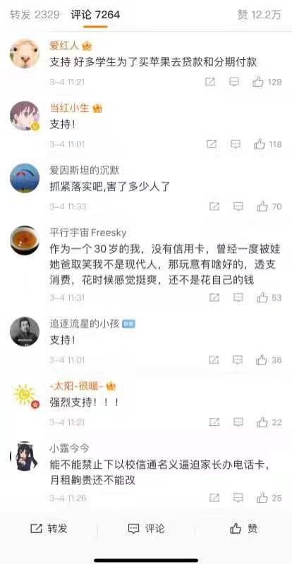 今年两会期间,一位全国人大代表的建议内容中提到“禁止给在校学生办理信用卡和提供分期等相关超前消费的金融服务”,话题冲上微博热搜,阅读量近3亿次。