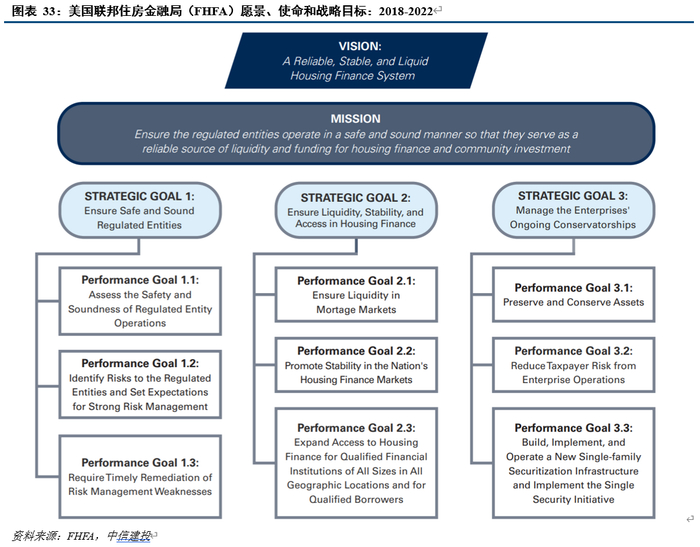 FHFA机构,依据HERA法案创建,整合联邦监管机构职能,将房利美、房地美和11家联邦住房贷款银行纳入统一监管,同时,专职致力于改进和发展房地产信贷系统,提升房地产贷款可获得性,降低房地产贷款利率,尝试创新房地产金融工具和基础设施,例如在新冠时期创设新冠疫情接续贷款、翻倍住房可承受基金拨款等。