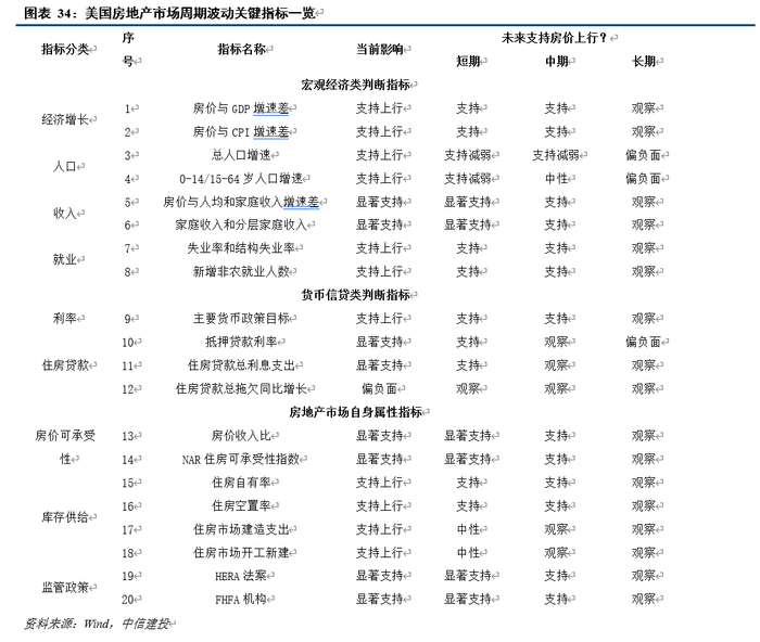 现在回到我们在第一章提出的问题,美国房地产市场开启上行周期了吗?2020年以来的加速上涨是短期行为还是长期趋势?我们将第二章和第三章分析的三大类20个关键因子结果归纳总结(图表34)发现,美国市场主要指标大多指向当前的上涨存在显著基本面支撑,并且未来展望相对乐观。