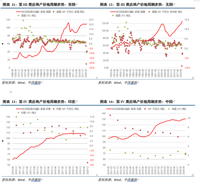 第IV类,尚未经历完整周期,房地产价格以单边上行为主。主要代表国家是印度和中国,主要共性表现为现代房地产市场建立时间较短,同时作为后发市场注重吸取前三类国家先发市场经验教训,房地产价格虽然涨幅明显,但尚未有显著回撤。