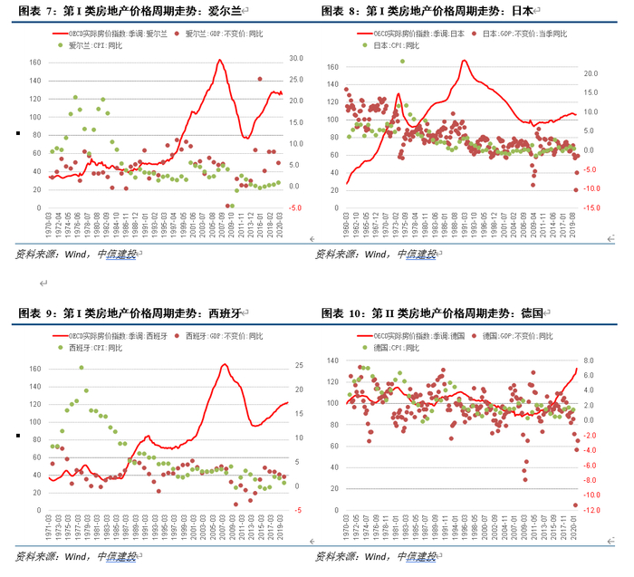 第I类,周期振幅剧烈,有显著的价格暴涨和暴跌阶段,并且未能再回到历史高点。主要代表国家是爱尔兰、日本和西班牙,主要共性表现为外向型经济体在经济起飞和高增长阶段对住房实体和资本市场未加有效调控,随经济高增长阶段已过和经济转型期到来,房地产市场硬着陆,房地产资产价格暴跌。