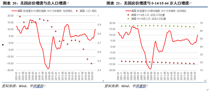 由于总人口增速相对房价是长周期慢变量,所以对2020年来美国房价增长影响不显著,虽然长期有下行趋势,但是中期稳定且有小幅上涨。具体看,近20年美国总人口增速呈逐年小幅下行态势、但尚保持在正值区间;0-14岁人口占总人口比重下降相对其他年龄段更快,但考虑2019年美国平均首次购房者年龄33岁、全部购房者年龄中位数47岁,人口结构变化尚需10-15年才能对住房需求构成实际压力,当前购房主力年龄段人口占比仍然稳定。