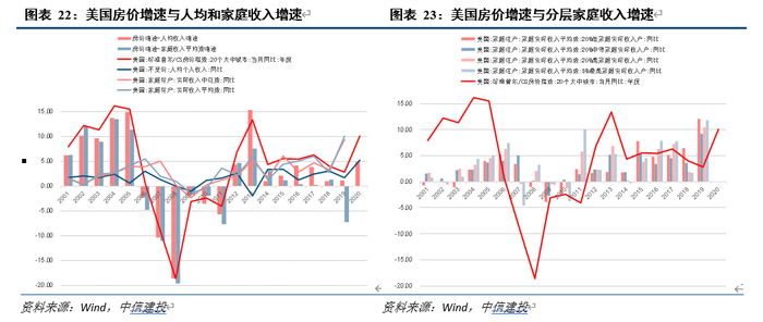 众多历史研究证明,居民收入增长是房价上行的显著相关因素,2015至2019年各层次家庭收入的显著增长和同期房价增速相对不快,似乎为2020年以来的房价增长提供了强劲支撑。具体看,2015年以来,各层级家庭收入均值皆较前期提升,尤其以低收入家庭和最高收入家庭更为显著;另外,值得注意的是,2019年实际家庭收入增速较大幅度超过同期房价增速,这一现象在非房价暴跌期较为少见,虽然有研究人员指出2019年统计数据抽样率及有效回复数量或受新冠疫情影响(实际调查时间发生在2020年新冠疫情期间)进而降低准确度,但尚没有进一步证据表明需要因此改变结论方向。