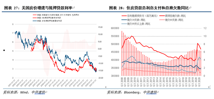 住房市场信贷环境的衡量,主要可考察房贷利率、房贷额度和违约拖欠情况,数据显示当前美国房地产市场受到住房贷款支持力度较大,后续存在边际减弱可能。具体来说,从房贷利率看,当前贷款利率水平已经处于2001年来历史低位,结合宏观利率环境,进一步下降概率和空间较小;从房贷额度和违约拖欠情况看,截至2020年第三季度最新数据,主要由于疫情因素影响,同比房贷违约拖欠数额出现较明显上行,同期房贷总利息支付数额也结束连续五年上行趋势。