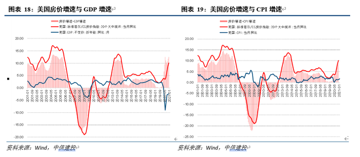 如图,2020年以来美国房价增速与GDP增速和CPI增速差值皆有上行,但整体仍保持在历史健康区间,中期支撑态势向好。与GDP增速差方面,即使当前GDP增速仍处于负值区间,增速差也未超出2001年至2006年房价持续上行阶段水平,未来随新冠疫情管控和经济恢复正增长,与GDP增速差有望被动收窄。与CPI增速差方面,目前仍低于2001年至2006年、2013年至2014年两个持续上行阶段均值,考虑当前存在的通胀预期,未来与CPI增速差也有望缩窄。