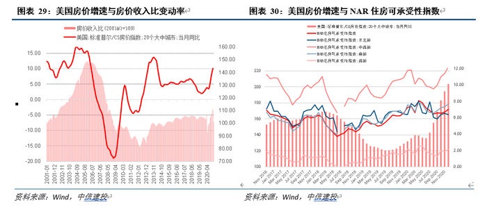 房价可承受性从住房需求者是否可承受角度考量房价变动的可持续性,测算结果显示,当前美国市场房价可承受性持续优化,虽然整体房价水平已反超2008年次贷危机峰值,但受益于近年家庭可支配收入增长,以房价收入比衡量的房价可承受性提升超过20%。同时,作为参考,美国房地产经纪人协会每月公布NAR指数,从家庭收入对协会评估的潜在房贷申请(即如果当下申请贷款购买当地平均水平住房)收入要求覆盖率进行测算,显示虽然2020年房价上行,但是平均覆盖率从2019年12月的167.2%上行至2020年12月的171.8%,住房可承受性继续延续改善趋势。