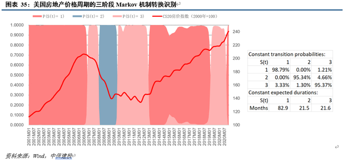 第四,我们同时应用Markov机制转换模型进行阶段识别(图表35),模型识别结果显示当前美国房地产价格大概率刚刚转入St(1)阶段,历史序列中同处于St(1)阶段的时期皆指向房价上行阶段,阶段平均持续时间长达82.9个月,进入阶段早期月份的保持(不转换)概率高达98.79%。