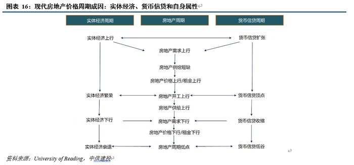 现代房地产价格周期,其成因既与实体经济周期和货币信贷周期高度相关,又兼具房地产市场自身特征。房地产既是实体经济活动发生和运行的场所和载体,又是债券、股票之后的第三大资产类别。从上文现代房地产市场体系架构和运行机制,可以发现,房地产市场运行与宏观经济和货币信贷因素高度相关,这一相关性也在本文第2.1节全球房地产价格周期历史回顾中得到历史验证。
