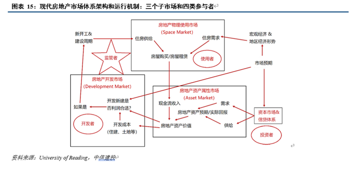 如想理解现代房地产市场价格周期成因,首先需要理解现代房地产市场体系架构和运行机制。现代房地产市场主要由三个子市场和四类参与者组成。三个子市场分别是,房地产物理使用市场、资产属性市场和开发市场;四类参与者分别是,使用者、投资者、开发者和监管者。三个子市场既相互独立、又相互影响,四类参与者对不同子市场影响路径和权重不同。使用者主要以最终需求通过物理使用子市场影响全局,投资者主要以资本供需通过资产子市场影响全局,开发者主要以住房供给通过开发子市场影响全局,监管者可以对全部三个子市场施加影响、影响力随监管偏好而不同、传统上对供给侧影响更加显著。