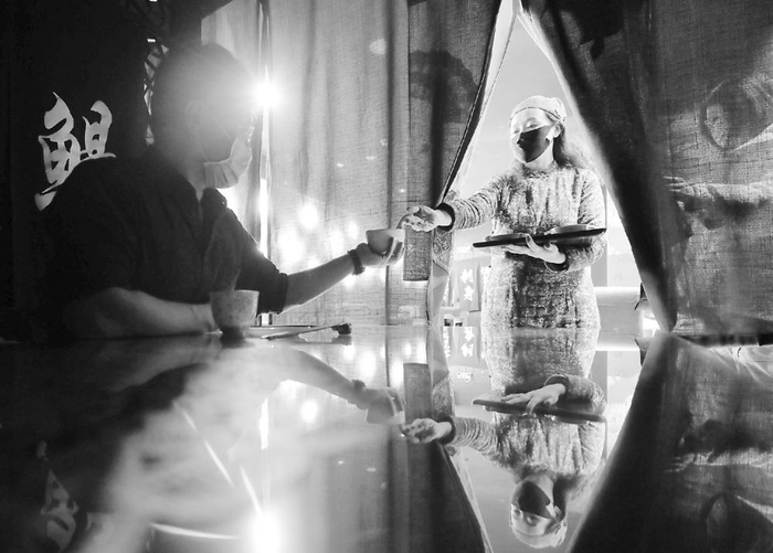 繁华的北京西单大街,商铺餐馆林立。和大街上的喧嚣相比,“隐藏”在一座大厦八层的“木马童话”黑暗餐厅却是另一番景象。餐厅的创始人于爽掀开微光就餐体验区的遮光门帘,为就餐的顾客送上菜品。餐厅的另一侧则是黑暗体验区,顾客们将手依次搭在引导员的肩上入内。厨房内,几位身障的厨师和服务员正在忙碌着。