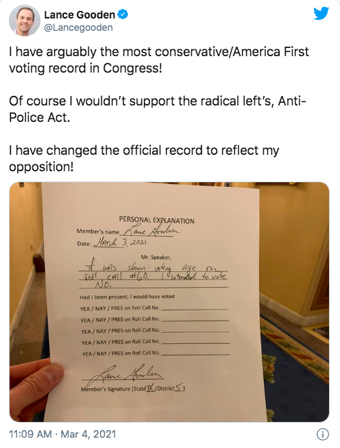 美国《国会山报》注意到,在投票中,唯一一名共和党人—来自得克萨斯州的古登众议员(GOP Rep。 Lance Gooden),对议案投出了赞成票。正当有媒体开始赞扬古登的党派协作精神时,古登却在社交媒体上做出澄清,称自己是在投票时一时“手滑”,按错了投票键。古登重申,“我绝不会支持激进的民主党人提出的‘反警察’议案。”