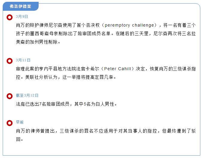 根据美国的陪审团遴选规则,控辩双方会在符合资格的候选人群中选出陪审团成员。在此过程中,控辩双方均有权直接否决对方选中的候选人(peremptory challenges)。在本案中,根据重罪案件保障被告权利的原则,辩方律师获得了15次无理由淘汰对方候选人的机会,而控方律师仅有9次机会。