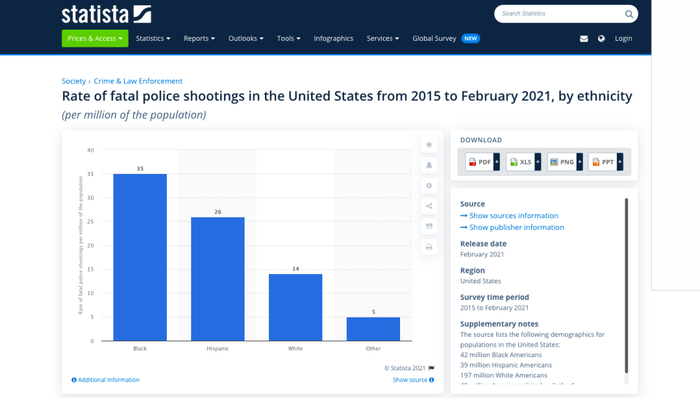 据美国普查局统计,从2015至2021年2月,非裔群体被警察枪杀的比率是白人的两倍多。