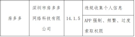 其中,存在问题的应用软件名单中涉及了深圳市房多多网络科技有限公司开发的“房多多”APP,版本号14.1.5。该软件涉及的问题包括违规收集个人信息,APP强制、频繁、过度索取权限。