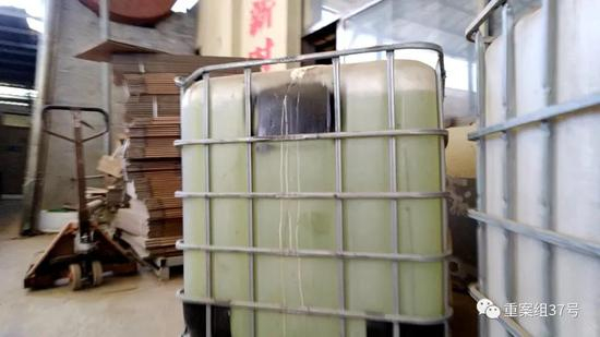 在车间门口,他指着地上的两个大型的正方体塑料桶,告诉记者桶里装的浅黄色液体正是次氯酸钠,“不贵,850元一吨,这一桶是1000块钱的,1.2吨。”