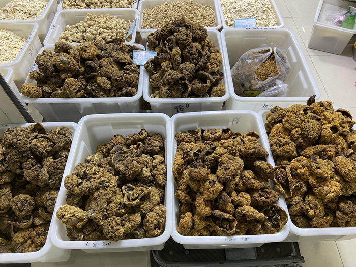 在6区,一位王姓商贩摆满了几大框土黄色的干货,框内扔着的标签显示,这些干货来自河南永城、山东菏泽等地。她称,“净货”每公斤1350元,“重货”大概每公斤800元。