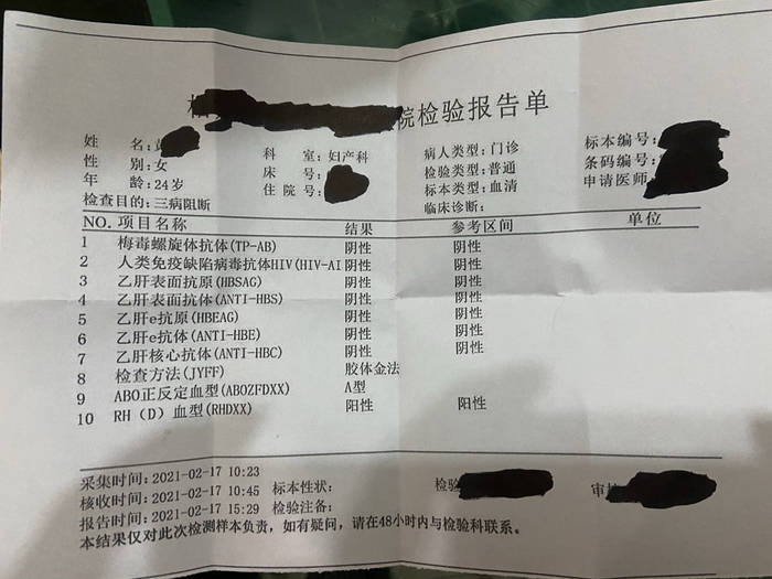 记者网购一个新鲜人体胎盘后,所附医院妇产科2月17日对24岁黄姓孕妇检验的报告单显示,其HIV、梅毒、乙肝病毒检测均为阴性。