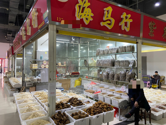 同样,在交易中心一楼经营紫河车业务的“顺昌药业”,从内到外摆满了一桶桶干货,一旁有人正在从车上卸干货。负责人称,他一个月稳定供应2-3吨紫河车,保证质量。