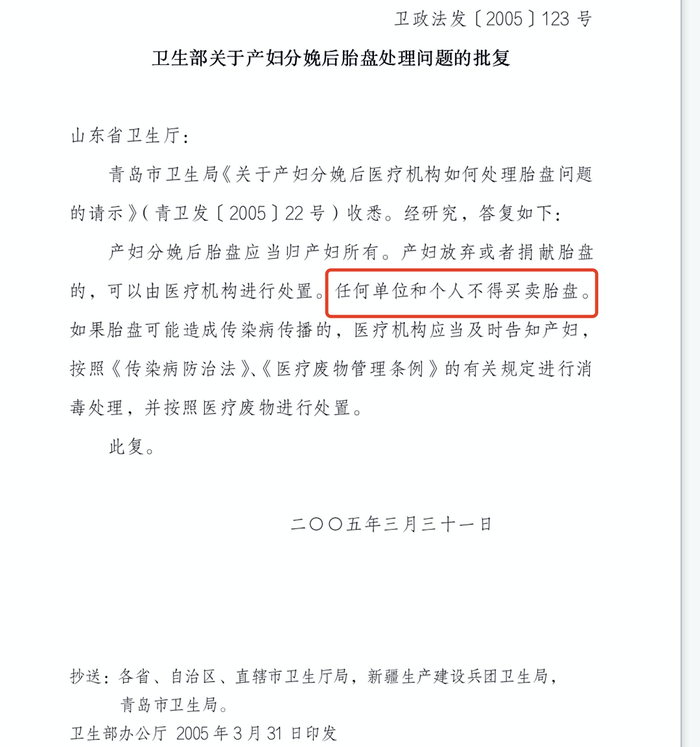 原卫生部的《卫生部关于产妇分娩后胎盘处理问题的批复》规定,产妇分娩后胎盘应当归产妇所有。产妇放弃或者捐献胎盘的,可以由医疗机构进行处置。“任何单位和个人不得买卖胎盘。”