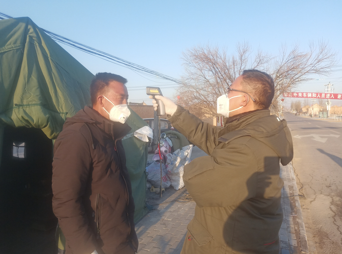 每次进村入口,我们便会看到这一幕:高高飘扬的党旗下,身穿迷彩服、佩戴医用口罩的阿涛挺立在寒风中,指挥着来往车辆和值守民兵死守卡点,身影高大伟岸。每次挨家挨户排查时,我们常会听到这一句叮嘱:“老乡,记得戴好口罩、勤洗手,不要串门,有发烧咳嗽的立即给我打电话。”十二天的彻夜未眠,阿涛的眼睛里布满了血丝,嘴皮干裂结了厚厚的血痂,但他仍在坚守。在村民“众志成城抗击疫情”的微信群里,一条“我们最暖心书记的抗疫日记”视频文字当日点赞量上千。
