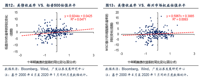 一般认为,美债收益率上行总体上对股市是一大利空,主要表现为估值重估。过去20年的经验显示,自2000年4月起至今,标普500、MSCI新兴市场指数有记录的估值变化,均与十年期美债收益率变化呈弱正相关性(图12、13)。这一结果并不具统计意义上的重要性,造成这一弱正相关关系的原因有很多,其中一个可能的原因是我们处在不同的长周期中,因而仅看20年的统计分析有偏差。自二战到上个世纪八十年代初,十年期美债收益率进入上行长周期;而自八十年代初到2020年,美债收益率进入了下行长周期。过去20年正处在下行长周期中,其间十年期美债收益率有5次短周期回升,平均持续时间12个月,平均利率上升幅度为1.05个百分点。很多时候温和通胀代表着经济反弹和企业盈利回升,利率的温和反弹对股市没有产生明显的不利影响。如果市场预期通胀继续上升,并将十年期美债收益率推入上行长周期,对股市的负面影响很可能会远大于过去20年的经验。