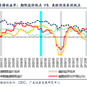 不同模型对期限溢价峰值的预测有所不同,但只影响十年期美债收益率变化的幅度,没有根本改变其拐点和路径。方案一即从最近三次期限溢价触底反弹的情形推算,期限溢价很可能在今年三季度升至逾0.5%的阶段性高位后开始回落,明年一季度或于0.2%附近触底,而后在二季度反弹至0.4%附近,反映市场风险偏好较低;方案二从最近三次美欧经济触底回升的情形推测,期限溢价未来一年半都可能围绕-0.4%的水平窄幅波动,反映市场风险偏好较高(图7)。