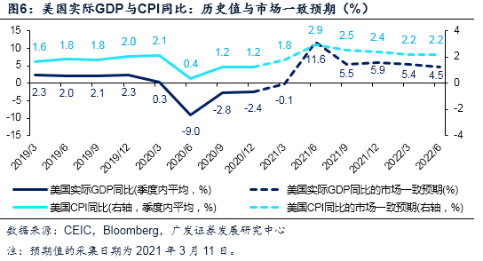 我们选择的系列模型均预测十年期美债收益率自今年三季度起会再次回落,其中市场预期届时美国经济增速和通胀水平会回归中长期运行轨道,是收益率回落的一大原因。同样地,美债收益率预测值之所以会在今年二季度快速攀升,与疫苗落地期间,市场对美国经济复苏和通胀上行的乐观预期有关。今年3月初的彭博调查显示,投资者认为二季度美国实际GDP、CPI同比有望分别升至11.6%和2.9%,均为短期内高点(见下一页,图6)。考虑到去年二季度美国实际GDP同比下跌9.0%,CPI同比仅增长0.4%,从累计增长率的角度看,市场预计二季度美国经济有望超越前年同期水平。