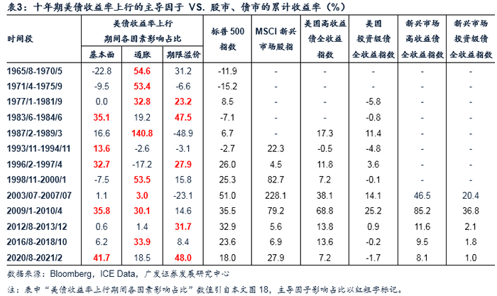 在不同时期,美债收益率影响因子的变化,同样也会影响大类资产的收益表现(见下一页,表3)。从过去的经验来看,主要表现为以下几个方面: