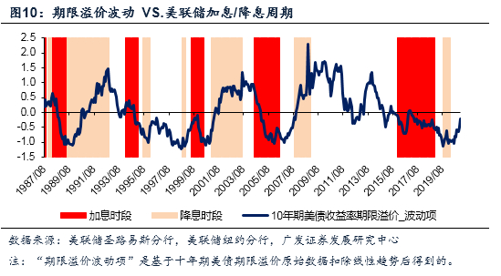从历史经验来看,宽松的货币政策也会推升期限溢价。相反地,宽松货币政策退出或收紧,会压低期限溢价。观察十年期美债收益率期限溢价波动与宏观政策周期(以加息/降息周期为代表)间的联系可见,进入加息周期时,期限溢价大概率会下行,这在很大程度上降低了货币政策收紧的有效性(图10)。短期来看,在全球经济复苏的可持续性明朗之前,货币政策退出仍需时日。美联储官员早前预测,2023年之前,美国很难实现2%的通胀率,这意味着,2023年之前,美联储不会考虑加息。