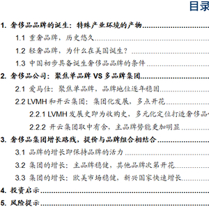 奢侈品的战略选择:聚焦单品牌VS多品牌集团。聚焦单品牌战略的公司,一般在公司初创就因为优质的质量和独到的设计受到市场欢迎,公司在发展中逐渐明确品牌定位,最终发展为细分市场龙头企业,单品牌公司在应对市场波动也比较容易做出快速反应,但固化的品牌形象一旦不被市场所喜爱之后公司风险极大;选择多品牌方向的公司,很多是出于拓展不同领域发展、占据细分市场的目的,此类公司在发展过程之中可以选择强势企业进行合并,并且可以在适合的时候将品牌势能不足的品牌抛出,保证主品牌发展动力,多元化的组合可以使集团能够更好应对市场喜好的变化,但集团对主品牌依赖过多也很容易带来风险。