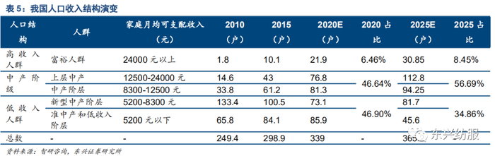 未来,中国中上收入家庭增加使得高端消费仍有较大增长空间。上层中产及富裕人群是奢侈品市场消费的主力军,未来几年这一群体的年均复合增长率扩张明显:富裕人群(家庭可支配月收入超过24000元人民币)的规模到2025年将在2020年的基础上增长41%,预计富裕人口将达到1亿人;上层中产是增长最快的一个群体,2025年将较2020年增长47%,复合增速达到8%,达到总人口的比重在30%以上。