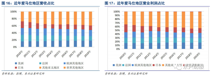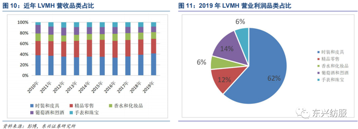 LVMH在分散化同时不失聚焦,多品类优势品牌共促增长。相较于开云集团,LVMH的品牌更加分散。从收入构成看,时装和皮具占到40%左右,是最大的品类。但是从利润看,时装和皮具占到60%以上。公司的时装和皮具皮品牌主要为LV和Dior,我们推测这两大品牌为公司的主要利润来源。结合前文我们分析的LVMH近年利润增速较好,我们推测公司其他品牌储备进入利润释放期都需要一定的时间。