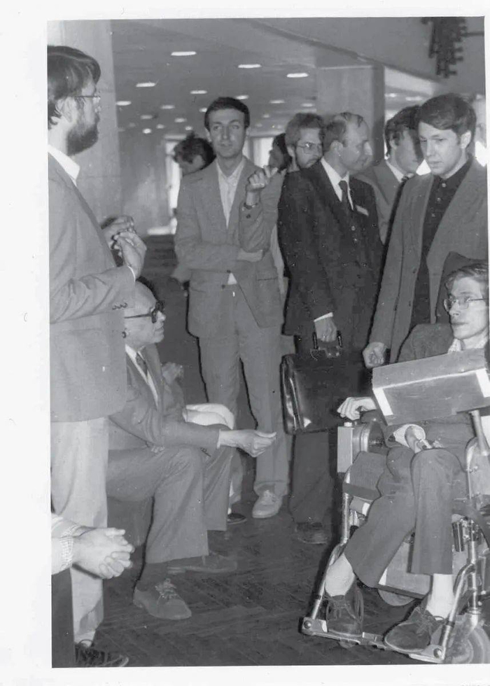 1987年,史蒂芬·霍金与林德(与霍金相邻站立者)。霍金对面坐的是前苏联原子物理学家安德烈·萨哈罗夫。© EP newsletter