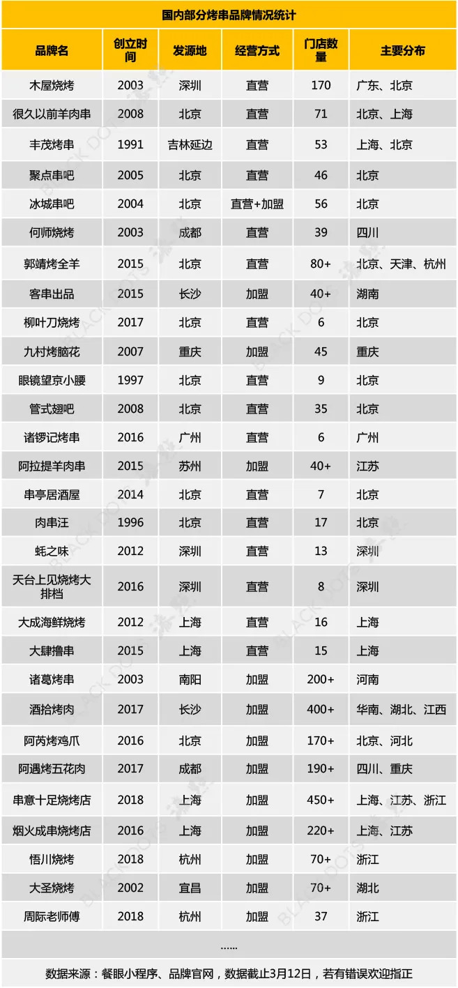 即便是国内口碑较好的木屋烧烤、丰茂烤串等品牌,门店数也尚未超过200家。