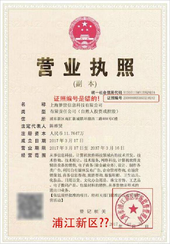 没错,他们确实提供了营业执照,可是这营业执照,仔细一看,就假得很。不仅证照编号是乱写的,盖章信息更是错得离谱,“上海浦江新区”在哪里呢?