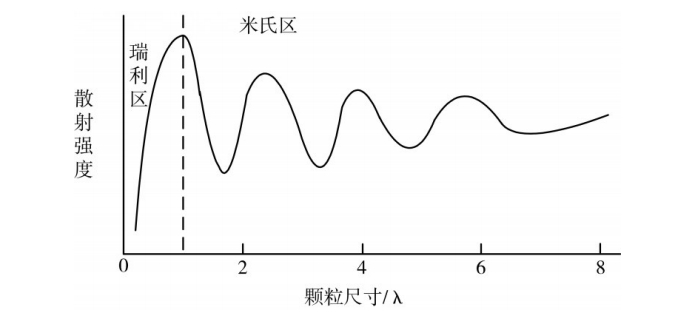 当粒子尺度接近或大于入射光波长时产生米氏散射,当发生米氏散射时,其各方向上的散射光强度是不一样的,米氏散射的散射强度与波长的二次方成反比。