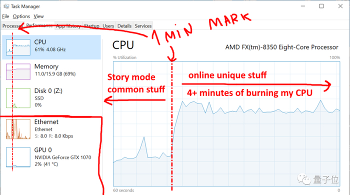 而且,他用的还是七八年前的硬件配置。CPU,是老而弥坚的AMD FX-8350,2012年上市,采用“推土机”架构,超频潜力惊人。而显卡,还是GTX 1070。