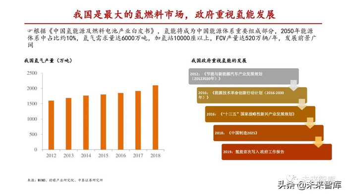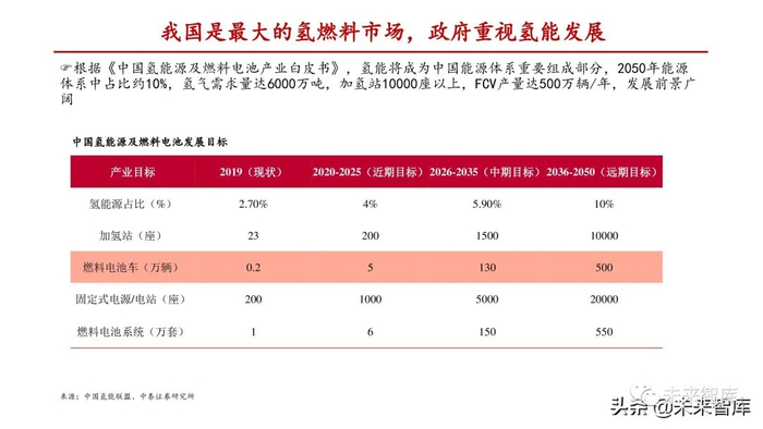 根据《中国氢能源及燃料电池产业白皮书》,氢能将成为中国能源体系重要组成部分,2050年能源 体系中占比约10%,氢气需求量达6000万吨,加氢站10000座以上,FCV产量达500万辆/年,发展前景广阔。